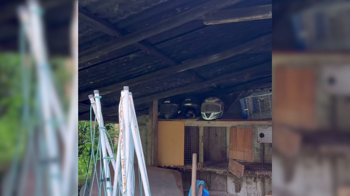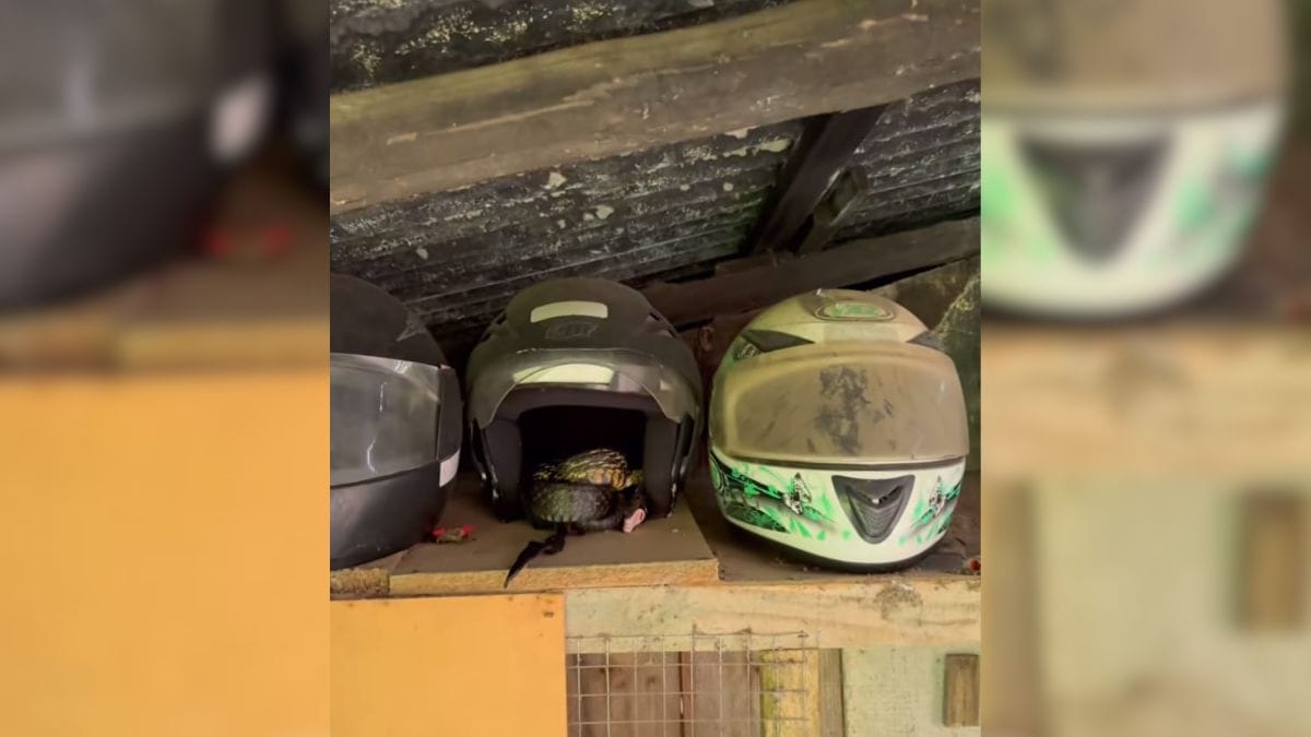 As imagens foram publicadas nas redes sociais do biólogo Christian Raboch Lempek. No local, o profissional encontrou o animal, que não é peçonhento, enrolado dentro de um capacete guardado em uma prateleira.