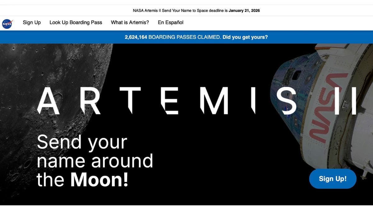 Em poucas semanas, uma operação da NASA vai marcar a história da exploração espacial. A missão Artemis 2 vai levar a humanidade de volta à Lua após mais de 50 anos. E, para celebrar, a agência espacial americana lançou um campanha virtual onde os internautas podem enviar seu nome para fazer parte dessa missão.