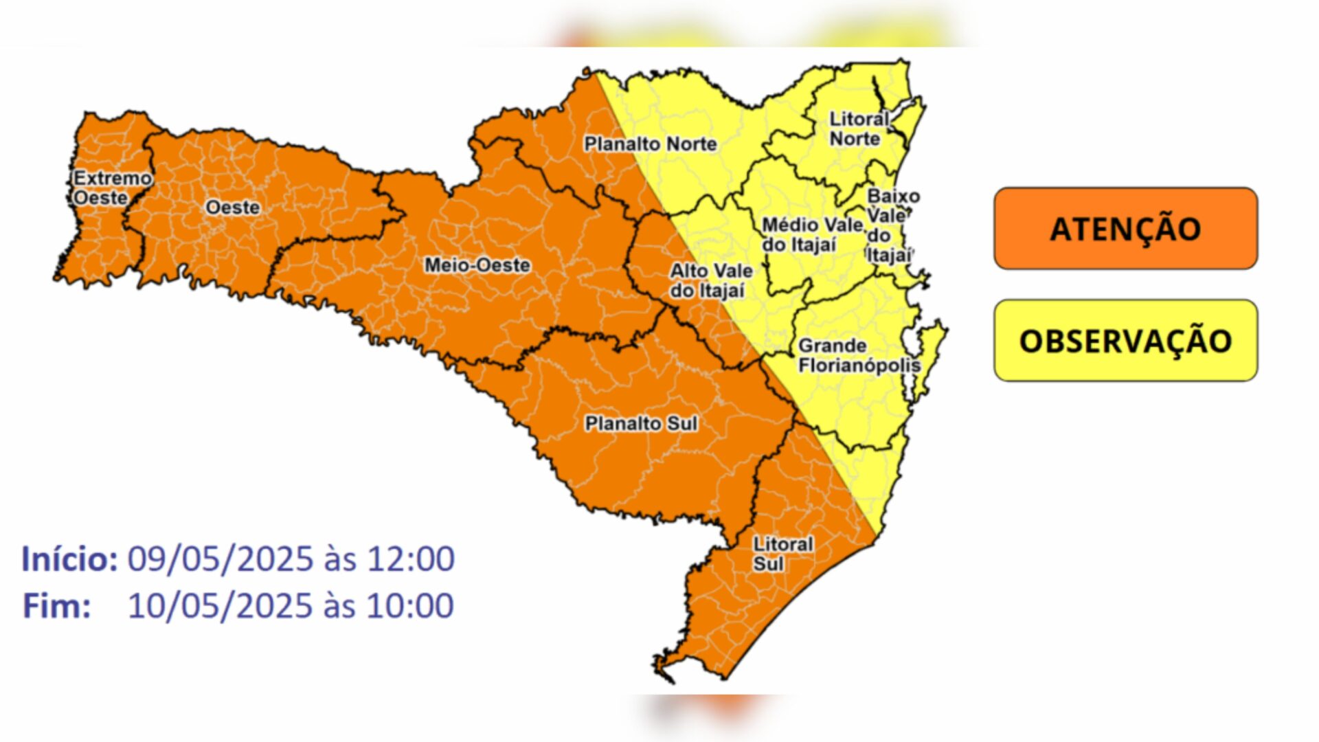 O dia começa com predomínio de sol em todas as regiões catarinenses, mas isso muda entre a tarde e a noite, quando a frente fria chega a Santa Catarina. De acordo com a Defesa, são esperados temporais, sendo que alguns são potencialmente intensos com raios, fortes rajadas de vento e precipitação de granizo, especialmente no Grande Oeste e nas áreas de divisa com o estado gaúcho.