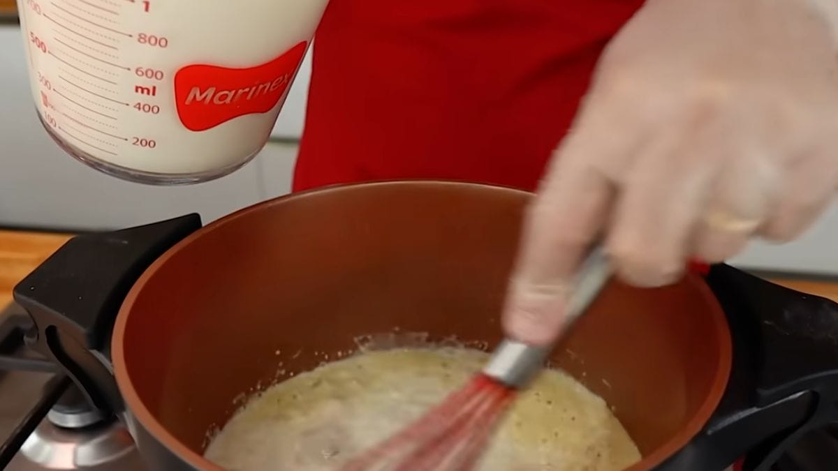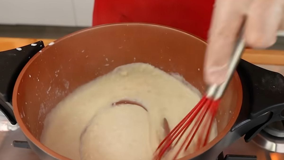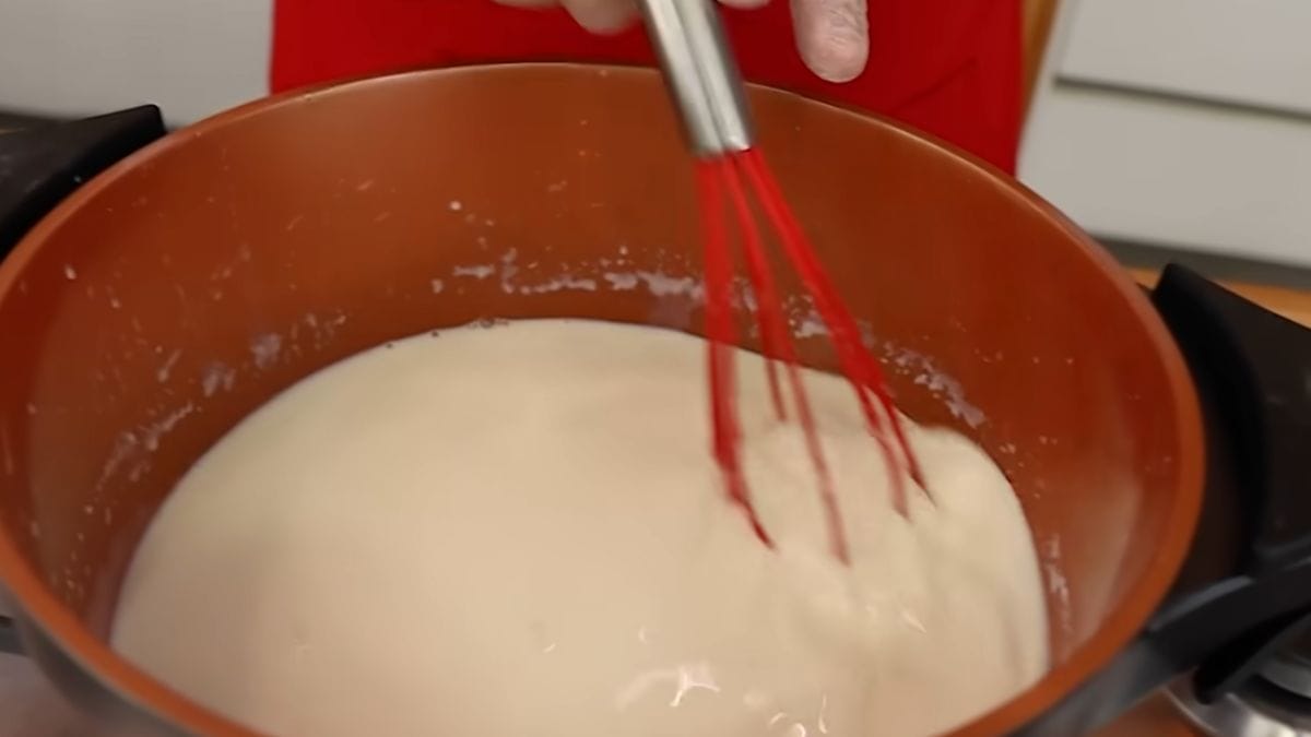- Adicione 1 litro de leite aos poucos, mexendo continuamente com um fouet para dissolver bem e evitar a formação de grumos;