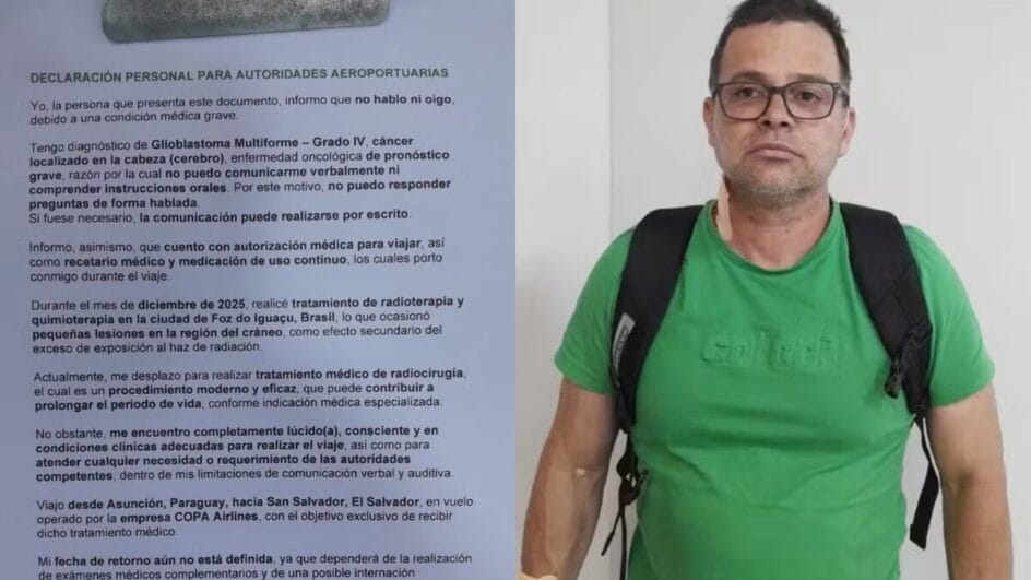O documento, intitulado “Declaração Pessoal para Autoridades Aeroportuárias”, afirma: “Eu, a pessoa que apresenta este documento, informo que não falo nem ouço, devido a uma condição médica grave. Tenho diagnóstico de Glioblastoma Multiforme – Grau IV, câncer localizado na cabeça (cérebro), doença oncológica de prognóstico grave, razão pela qual não posso me comunicar verbalmente nem compreender instruções orais. Por esse motivo, não posso responder perguntas de forma falada”.