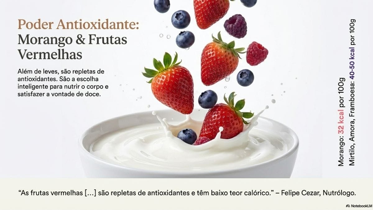 Além de leves, são ricas em antioxidantes. Cezar lembra que “as frutas vermelhas (morango, framboesa, amora) são repletas de antioxidantes e têm baixo teor calórico.”