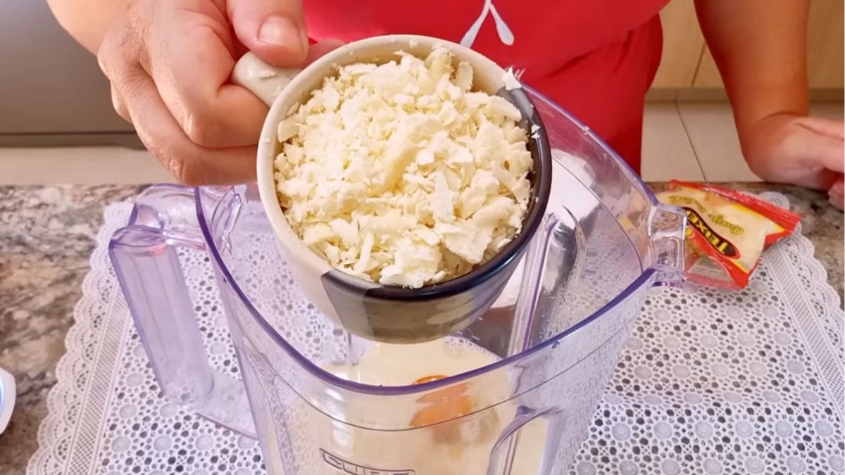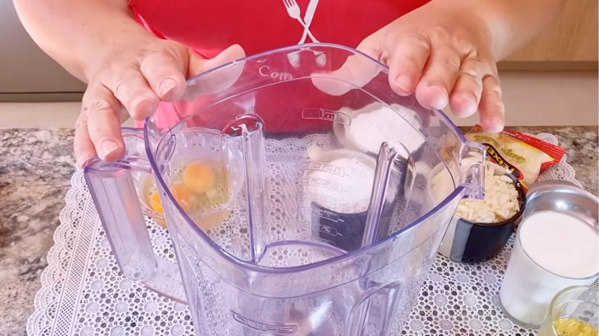 Primeiro, coloque os ovos no liquidificador e acrescente o leite, o óleo, o sal e o queijo ralado. Em seguida, adicione o polvilho e ligue o aparelho.