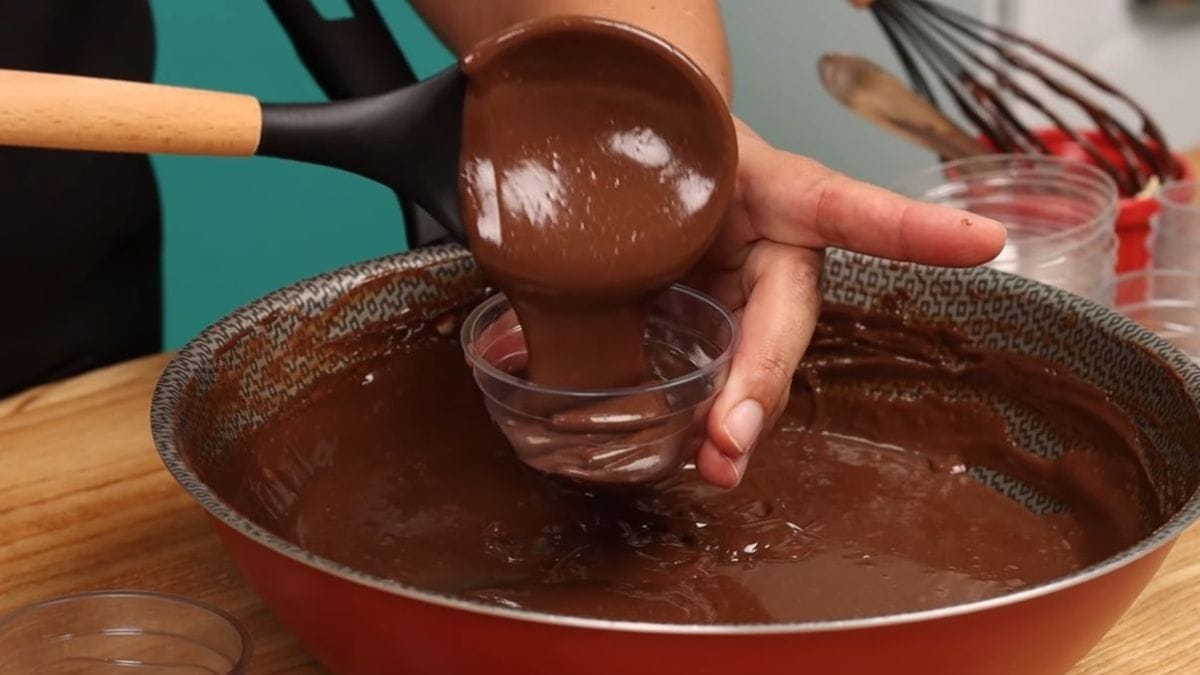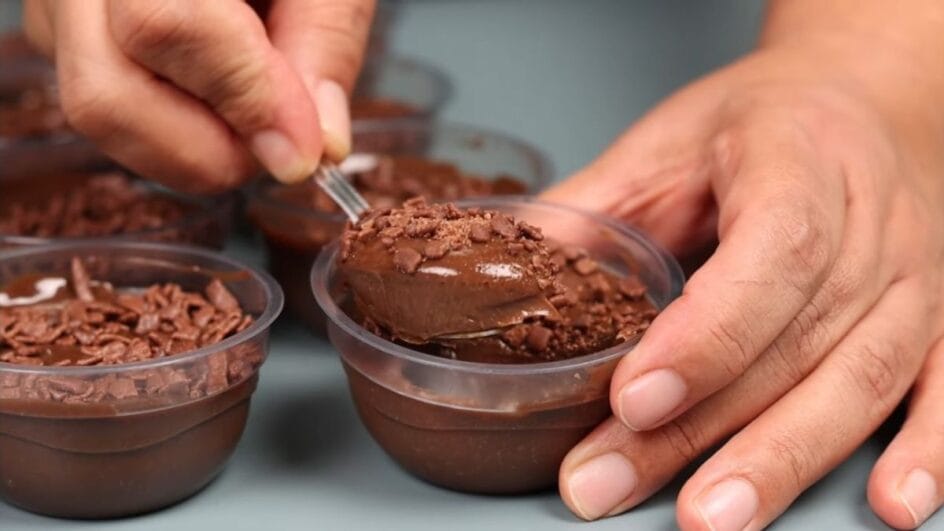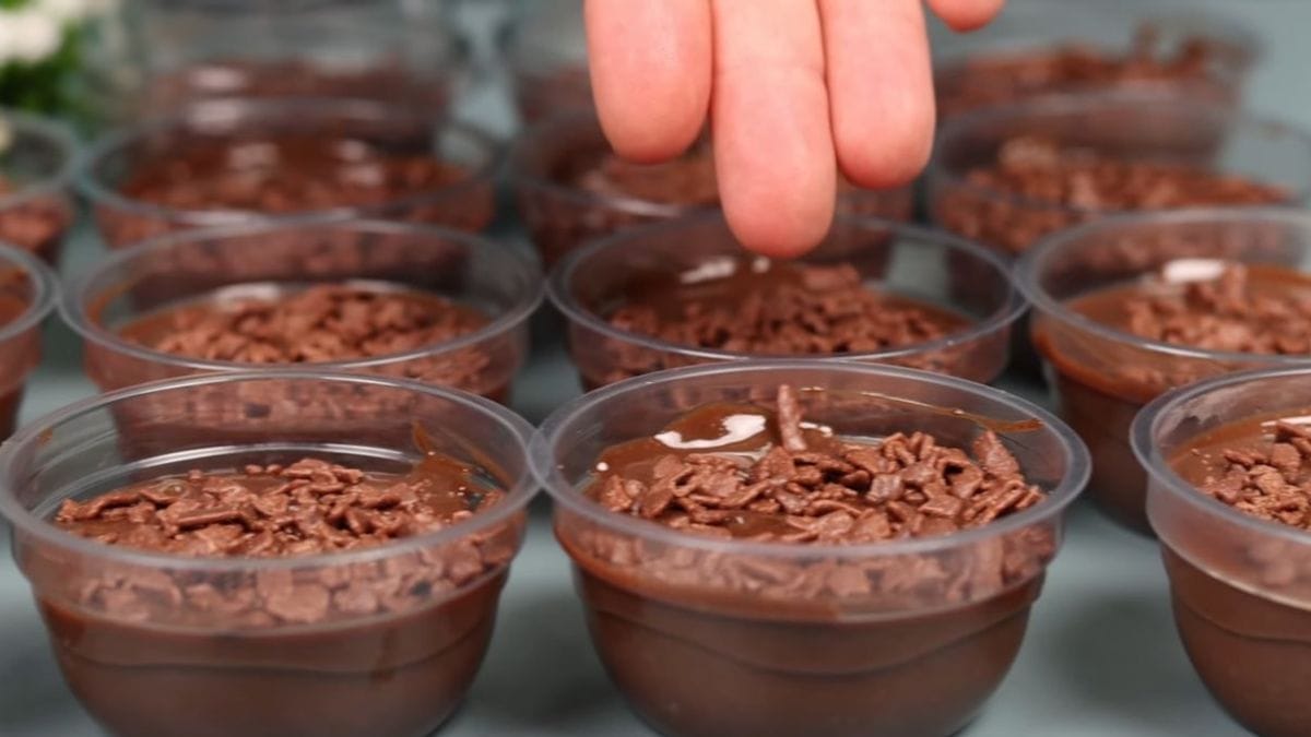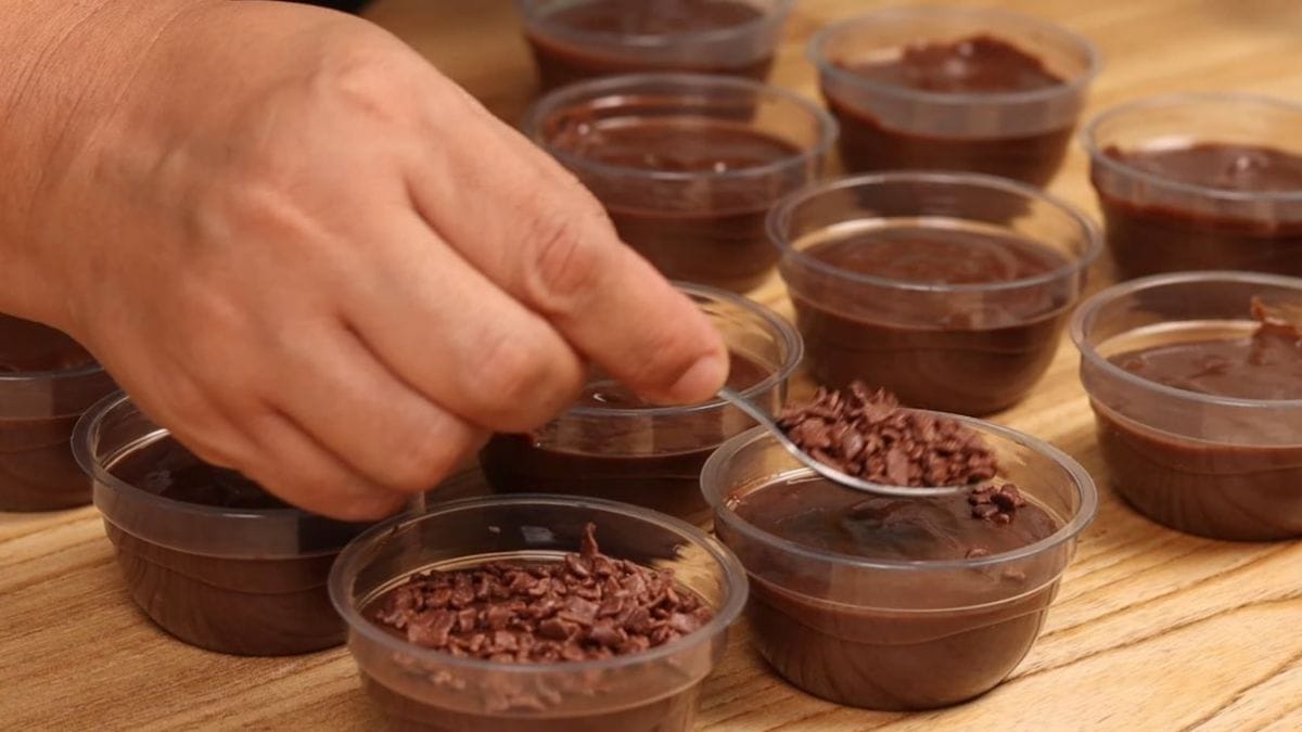 Com ajuda de uma colher, coloque o creme em potes de 75 ml até quase a borda. Decore com os flocos ou granulado de chocolate. Tampe os potes e leve à geladeira por pelo menos 2 horas até ficar bem gelado.