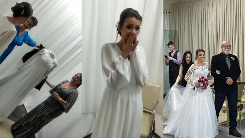 O vestido por pouco não fechou, mas ficou perfeito no corpo de Gabriela. Levada pelo pai, Menega Meneguetti, que tinha a ajudado com os gastos do penteado e maquiagem, mas também não sabia da surpresa, chegou ao altar. No caminho, foi descobrindo os padrinhos e madrinhas, surpreendendo-se com os detalhes do próprio casamento.