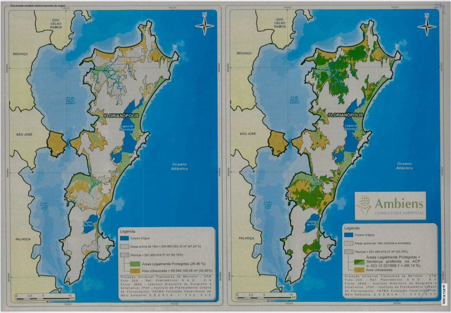Um estudo feito por uma consultoria ambiental para fornecer informações no processo projetou como ficaria a situação em Florianópolis caso a tese do Ministério Público seja acolhida: a área legalmente protegida como APP passaria de 26,46% para 66,14% do território da Ilha. Na prática, a mudança quase triplicaria a área da cidade considerada como de preservação permanente, deixando nesta condição quase um terço do território. Segundo mapa oferecido pela empresa contratada por uma das partes (veja na galeria acima), o maior impacto se daria nas regiões Norte e Sul da Ilha.