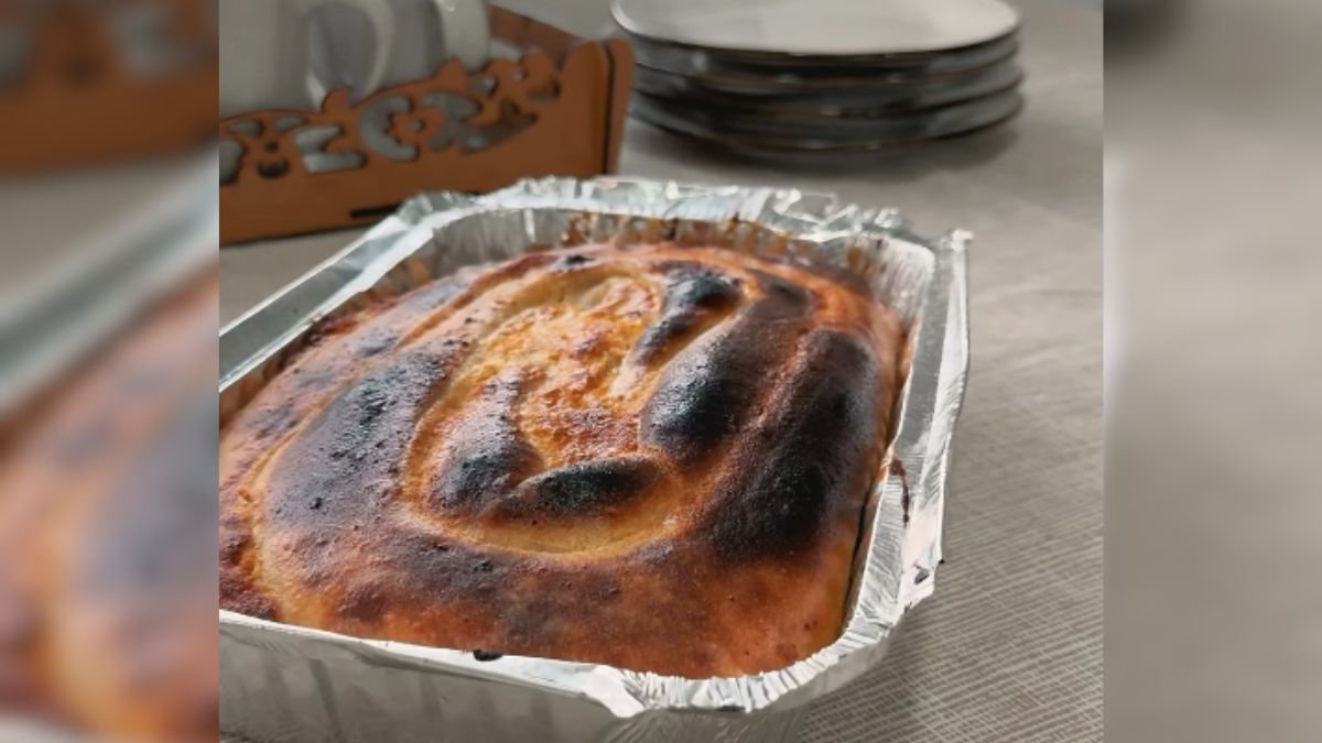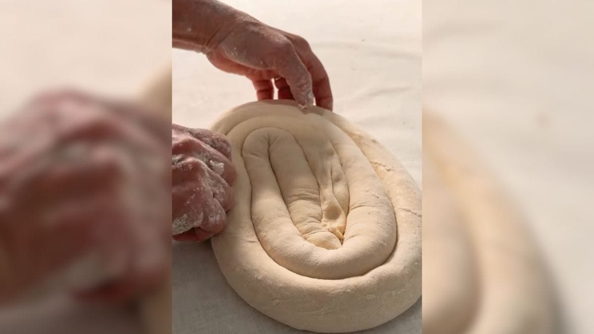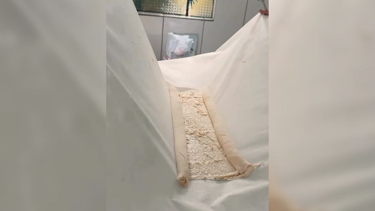 Depois, a massa descansa e precisa ser esticada até ficar bem fina, até quase ficar “transparente”, como mostra o vídeo mais abaixo. Após esticada, basta preencher com o recheio. Neste caso, de queijo ricota com um creme especial.