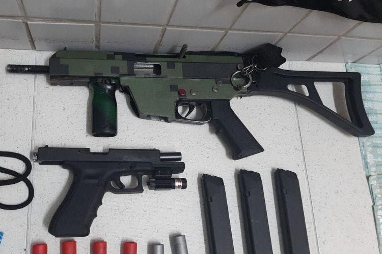 A submetralhadora encontrada é de fabricação artesanal. Foram apreendidas 129 munições, uma pistola, 4Kg maconha, 432 cocaína, 93 ecstasy e uma balança.
