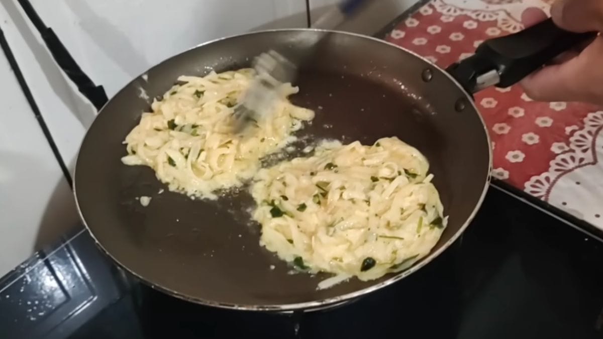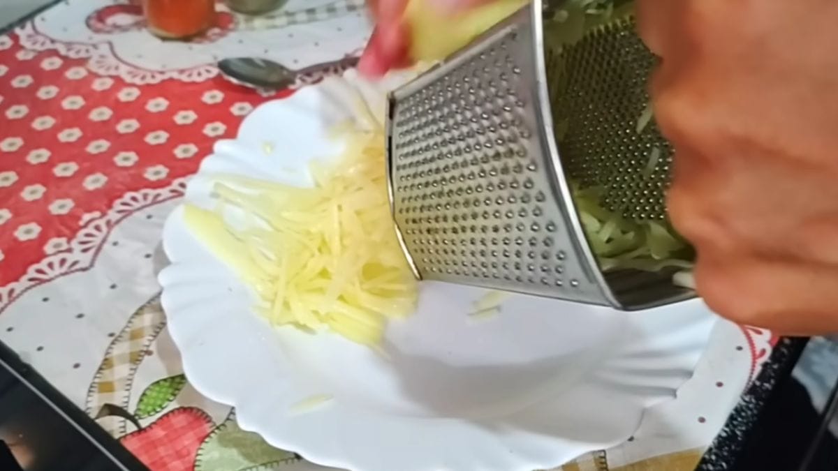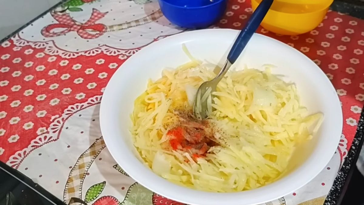 Primeiro, prepare base: Lave, rale e transfira a batata para uma tigela. Em seguida, adicione dois ovos inteiros e misture bem até incorporar.