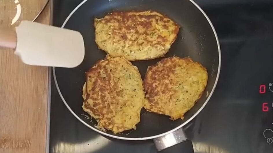 Após cerca de três minutos, vire os bolinhos delicadamente com uma espátula e cozinhe do outro lado até dourar, mais quatro minutos. Sirva como preferir.