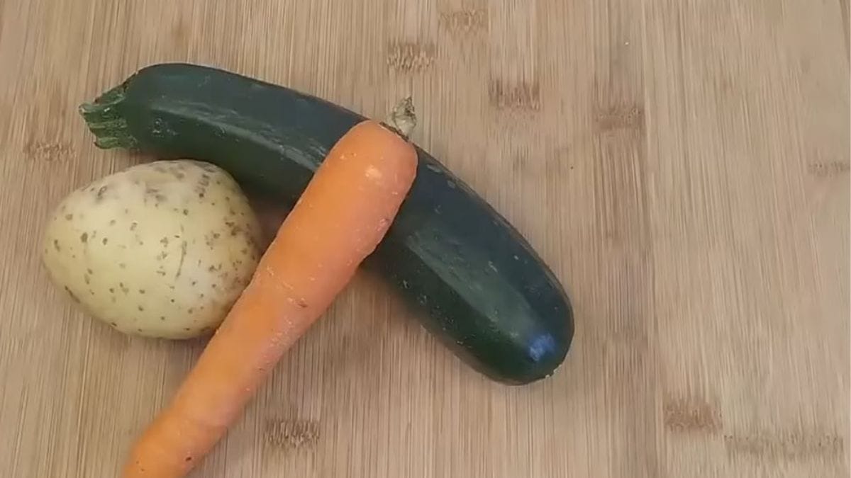 Primeiro, lave bem os legumes. Descasque a cenoura e a batata e reserve a abobrinha com a casca. Em seguida, rale a cenoura, a batata e a abobrinha, utilizando a parte grossa do ralador.
