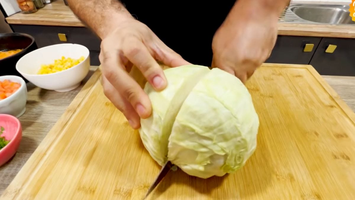 Primeiro, corte o repolho ao meio com a faca deitada e incline para fatiar bem fininho, como fios delicados. Em seguida, em uma tigela grande, junte o repolho fatiado, milho verde, tomates picados em cubinhos (sem miolo para evitar água), cebola picada, salsinha para cor, cenoura ralada e as maçãs em cubinhos (descasque e retire miolo para evitar oxidação).