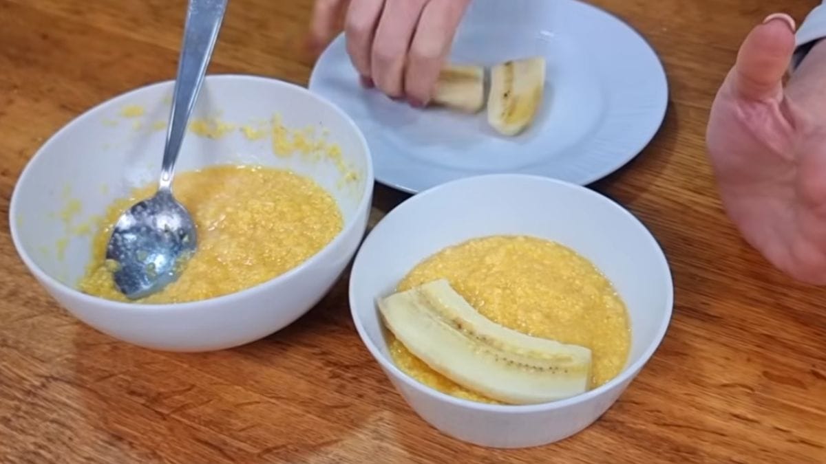 Acrescente mais uma camada com a “massa” de flocão de milho e finalize com mais algumas tiras de banana em cima. Leve para assar por 20 minutos e sirva como preferir.