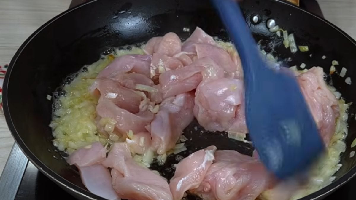 Primeiro, cozinhe o macarrão. Em seguida, prepare o molho de alho e óleo. Em uma frigideira, coloque o azeite, a manteiga, a cebola, os dentes de alho e o frango em tiras. Misture bem.