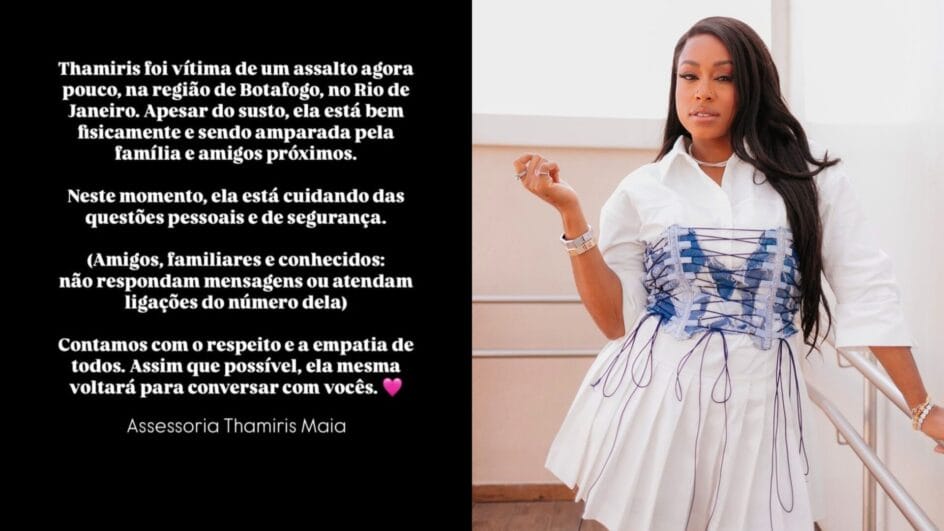 “Apesar do susto, ela está bem fisicamente e sendo amparada pela família e amigos próximos. Neste momento, ela está cuidando das questões pessoais e de segurança”, diz a assessoria de Thamiris em nota.