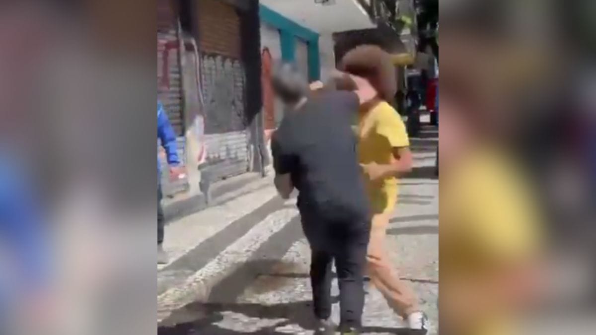 O deputado incita a briga no início, falando ao homem de camiseta preta: “Vamos, bonitão.” Em certo momento, o parlamentar é atingido com um soco no rosto e cai no chão, mas logo levanta e os dois continuam as agressões.