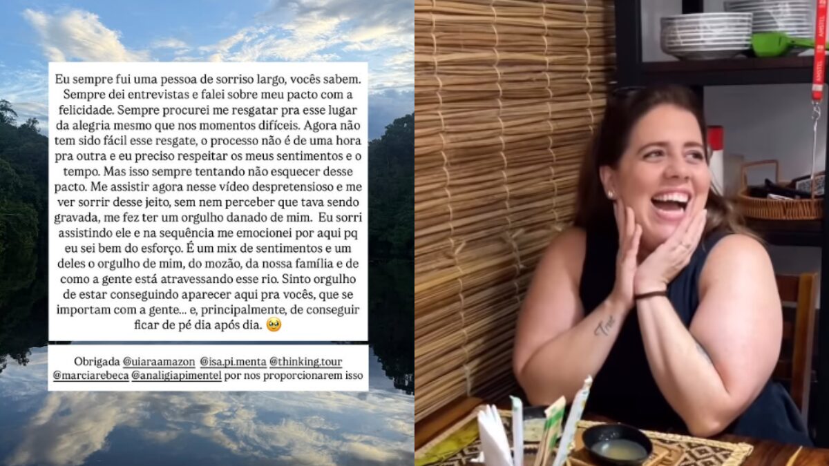 Viajando por Manaus, no Amazonas, Tati Machado compartilhou alguns momentos do passeio, nas redes sociais, na quarta-feira (2). A apresentadora publicou um vídeo em que aparece dando risada e fez um desabafo, após perder o bebê que esperava com o marido, Bruno Monteiro.