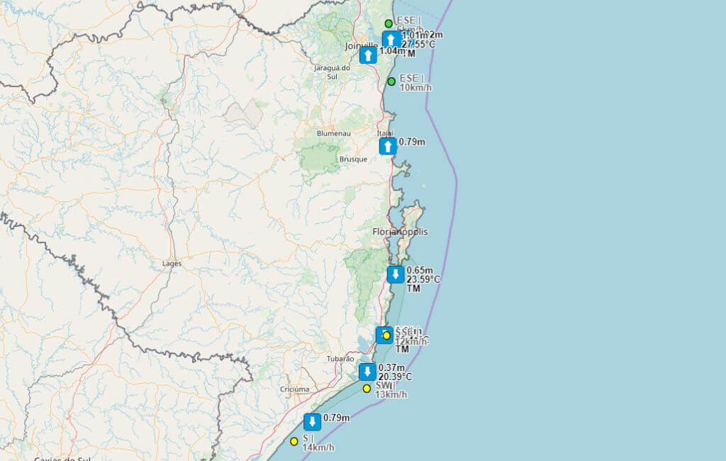 Há pontos com dados disponíveis em praias de Passo de Torres, Laguna, Imbituba, Balneário Camboriú, Itapoá e Caieira da Barra do Sul, em Florianópolis. No mapa, também aparecem outros locais, como Joinville Iate Clube, em Joinville, e Ilha da Paz, em São Francisco do Sul, porém só aparecem a medição da maré observada.