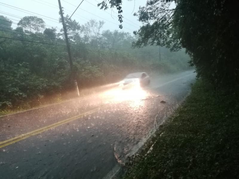O teto de um posto de gasolina no Norte da Ilha desabou com a força dos ventos. A cobertura se contorceu e caiu sobre a loja de conveniência e sobre as bombas de gasolina logo no começo da tempestade. Ninguém se feriu, mas em um dos dois carros atingidos havia uma pessoa.