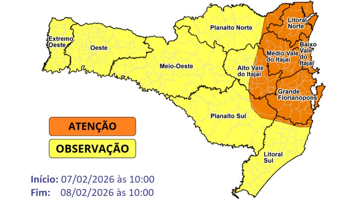 A Defesa Civil de Santa Catarina emitiu um alerta para temporais com chuva intensa em Santa Catarina no sábado e domingo por conta da frente fria que se aproxima. A Grande Florianópolis, parte do Vale do Itajaí e o Litoral Norte são as áreas mais afetadas. O risco varia de moderado a alto para ocorrências associadas a temporais, como destelhamentos, danos na rede elétrica e queda de galhos e árvores.