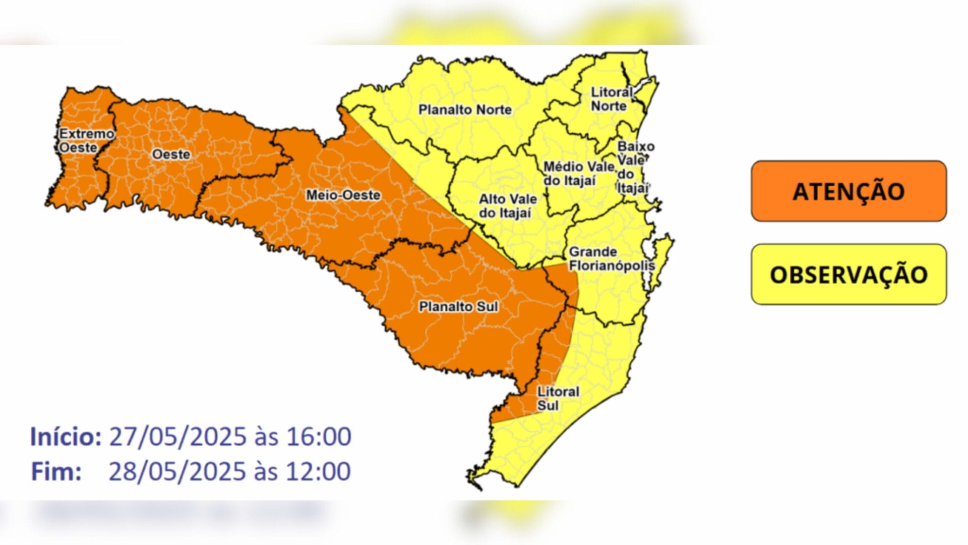Na sexta-feira (30), o tempo fica mais seco com chance de geada ampla por toda Santa Catarina, e ventos de sudoeste a sul, fraco a moderado, com rajadas mais intensas no litoral e sul do Estado, na madrugada e manhã, com o ciclone extratropical afastando-se em direção ao mar.