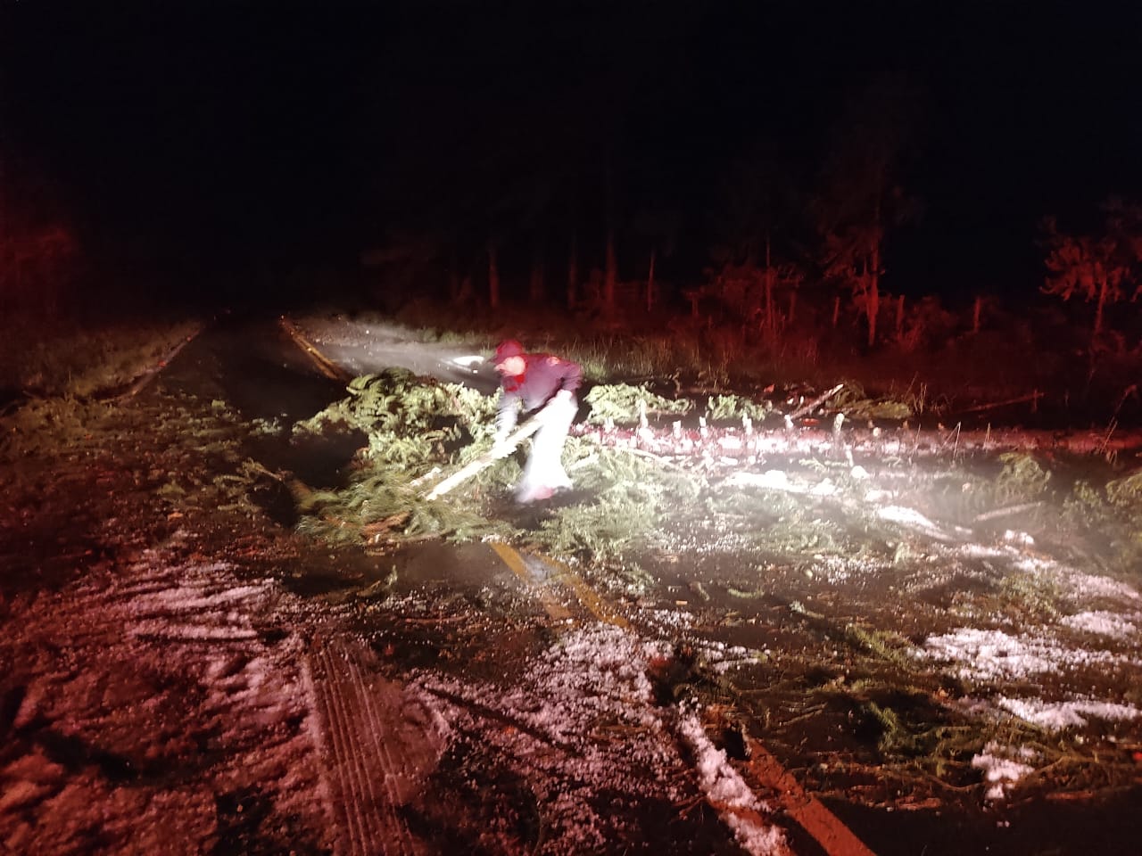 Os bombeiros militares atenderam às 21h30min uma ocorrência de queda de pinheiro no meio de uma rua. Após os cortes no tronco com a motosserra, limpeza dos galhos e gelo que estavam sobre a pista, a guarnição desobstruiu e liberou a via.