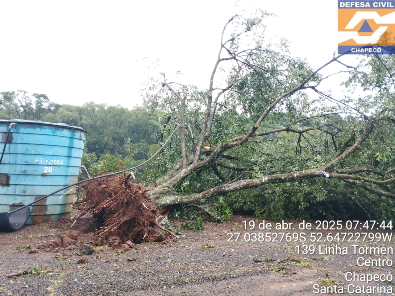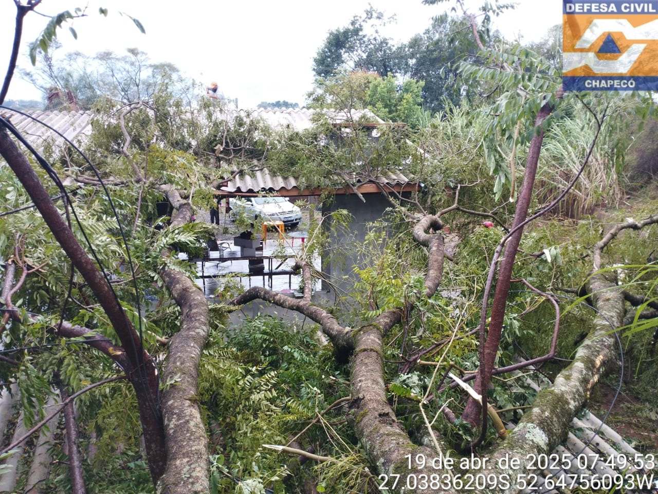 Em Chapecó, moradores relataram que a chuva forte começou por volta das 6h deste sábado e durou minutos. O maior problema não foram os 22 milímetros acumulados, segundo dados da Defesa Civil, mas sim a ventania. De acordo com o coordenador municipal da Defesa Civil, Walter Parizotto, 59 residências foram atingidas. O órgão entregou lonas e os atingidos devem trabalhar no conserto dos telhados ao longo deste sábado, já que o tempo limpou logo após a tempestade.