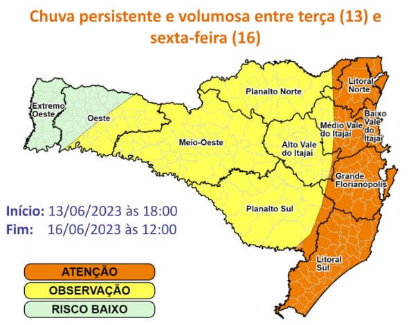 Por conta disso, o risco é alto para ocorrências como alagamentos, enxurradas, inundações e deslizamentos nas regiões do Litoral Norte, Foz do Rio Itajaí, Médio Vale do Itajaí, Grande Florianópolis e Litoral Sul.