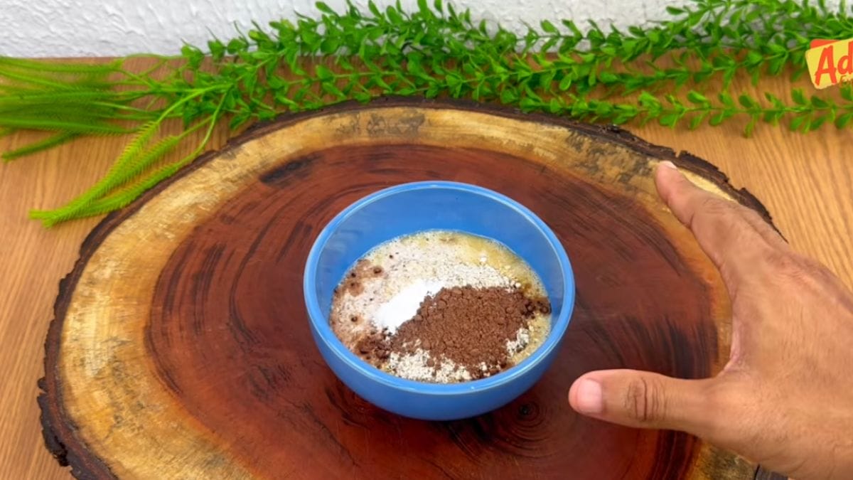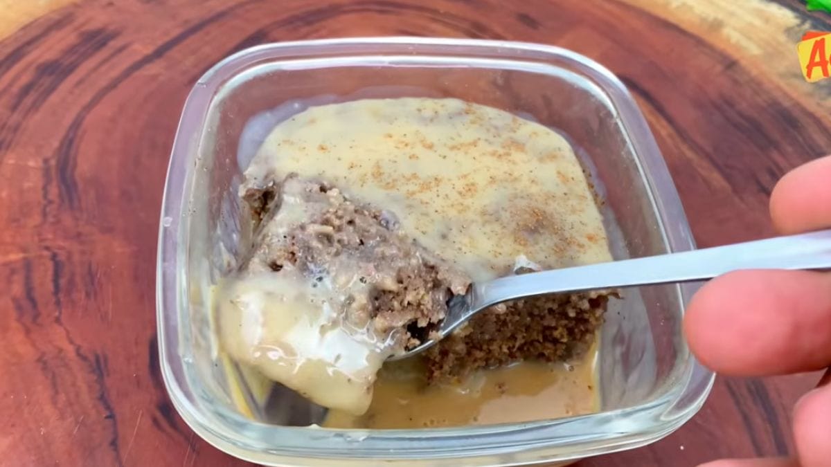 Acrescente o cacau em pó, o leite, o fermento e a canela. Misture novamente até atingir o ponto certo. Leve a massa para um recipiente e deixe assar no micro-ondas por alguns minutos. Finalize como preferir.