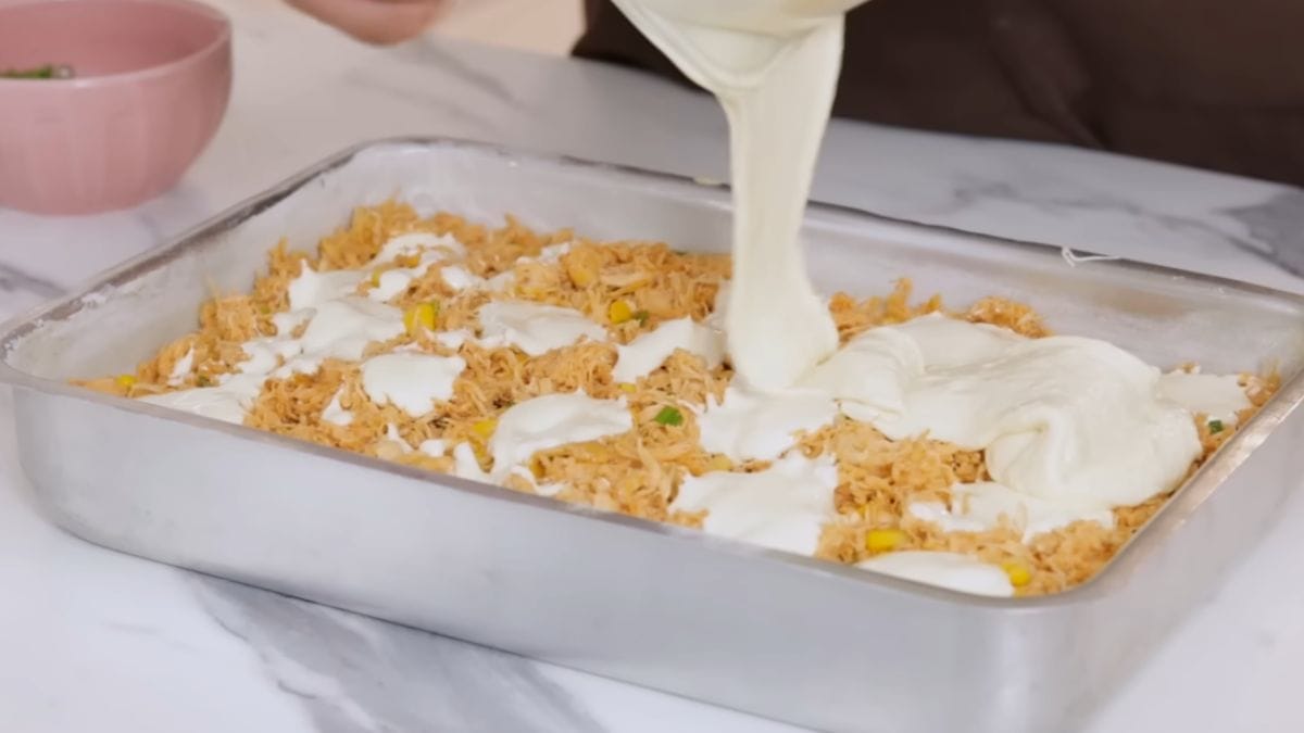 - Distribua um copo de requeijão cremoso sobre o frango em porções;