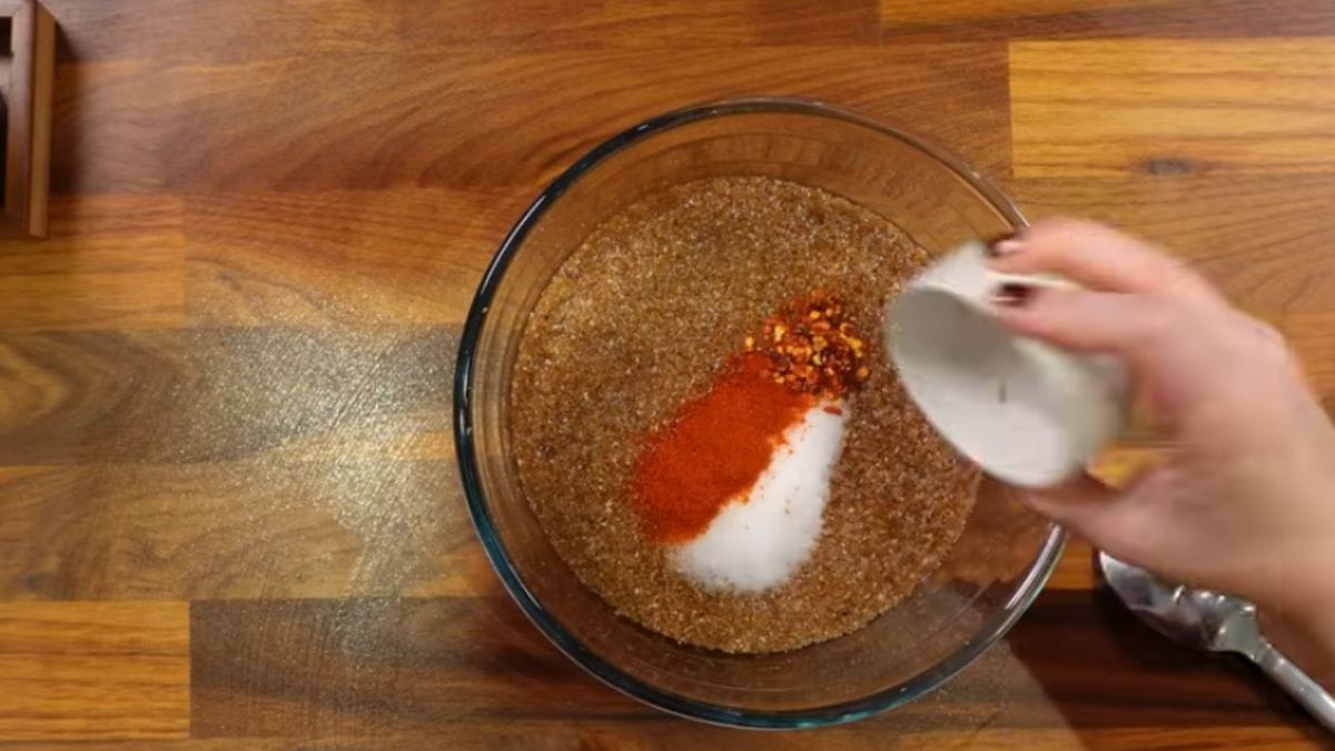 Agora, adicione o sal, a páprica, o café, a pimenta, a canela e misture. Em seguida, coloque a salsinha, o coentro, a cebolinha e a cebola em um liquidificador e triture.