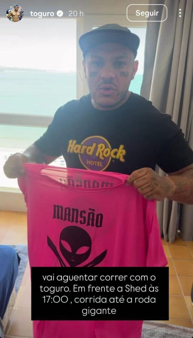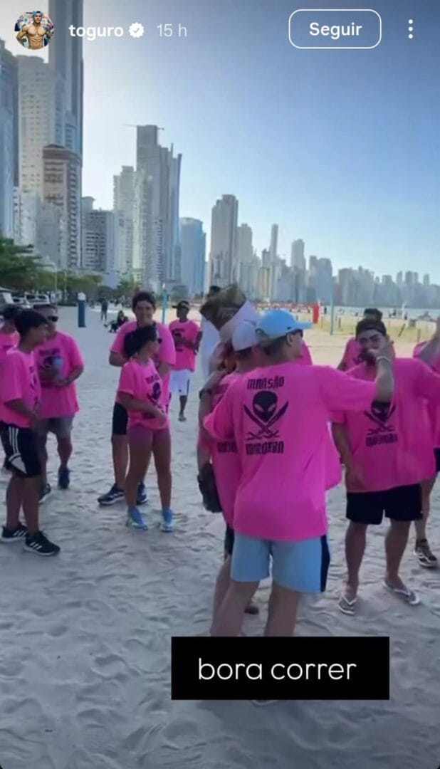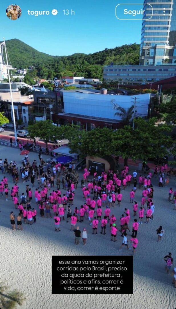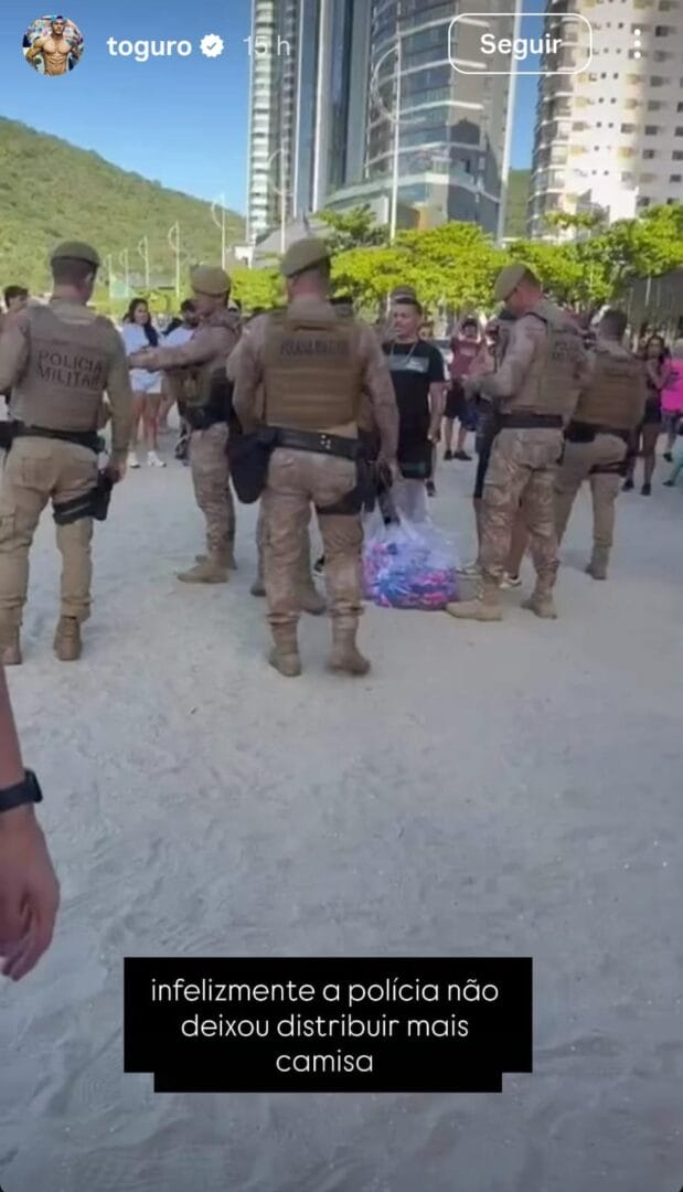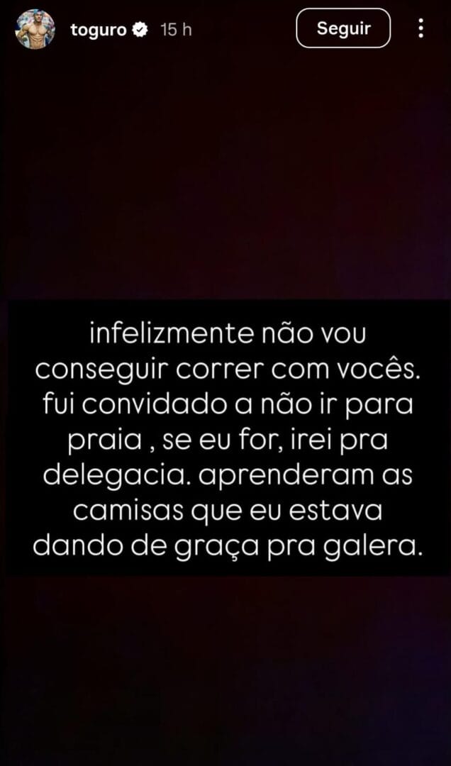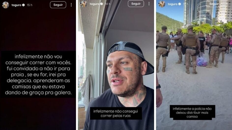 A mais recente confusão ocorreu nesta segunda-feira (5). Toguro fez um vídeo convidando os seguidores para uma corrida de rua na Praia Central, com distribuição de camisetas. Várias pessoas compareceram, mas o evento não ocorreu. Como não tinha autorização, a PM barrou a atividade.