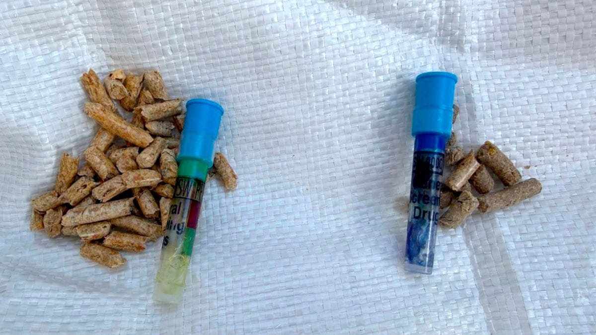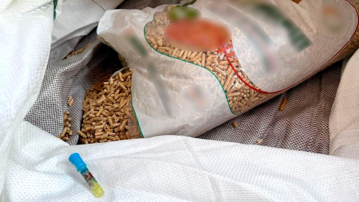 No total foram retidos 142 sacos com pellets de madeira, misturados com a substância análoga à cocaína, totalizando cerca de 1,6 tonelada de material que podem estar contaminados com o entorpecente.