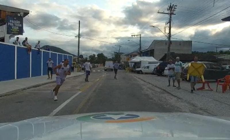 As imagens mostram que a viatura escoltava o ônibus da organizada do JEC no momento em que registrou os torcedores do Avaí pulando o muro. O vídeo mostra alguns dos homens correndo, um deles inclusive pega uma mesa de plástico na mão (veja abaixo). Outros partem em direção ao veículo da torcida adversária.