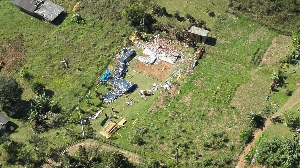As imagens dos estragos feitos com drone pelo Coordenador Regional de Defesa Civil de Canoinhas mostram ainda danos na vegetação em forma de rastro, com muitas árvores tombadas em diferentes sentidos, outras decepadas ao lado de intactas, um galpão parcialmente destruído e uma residência que teve todo seu telhado destruído. .