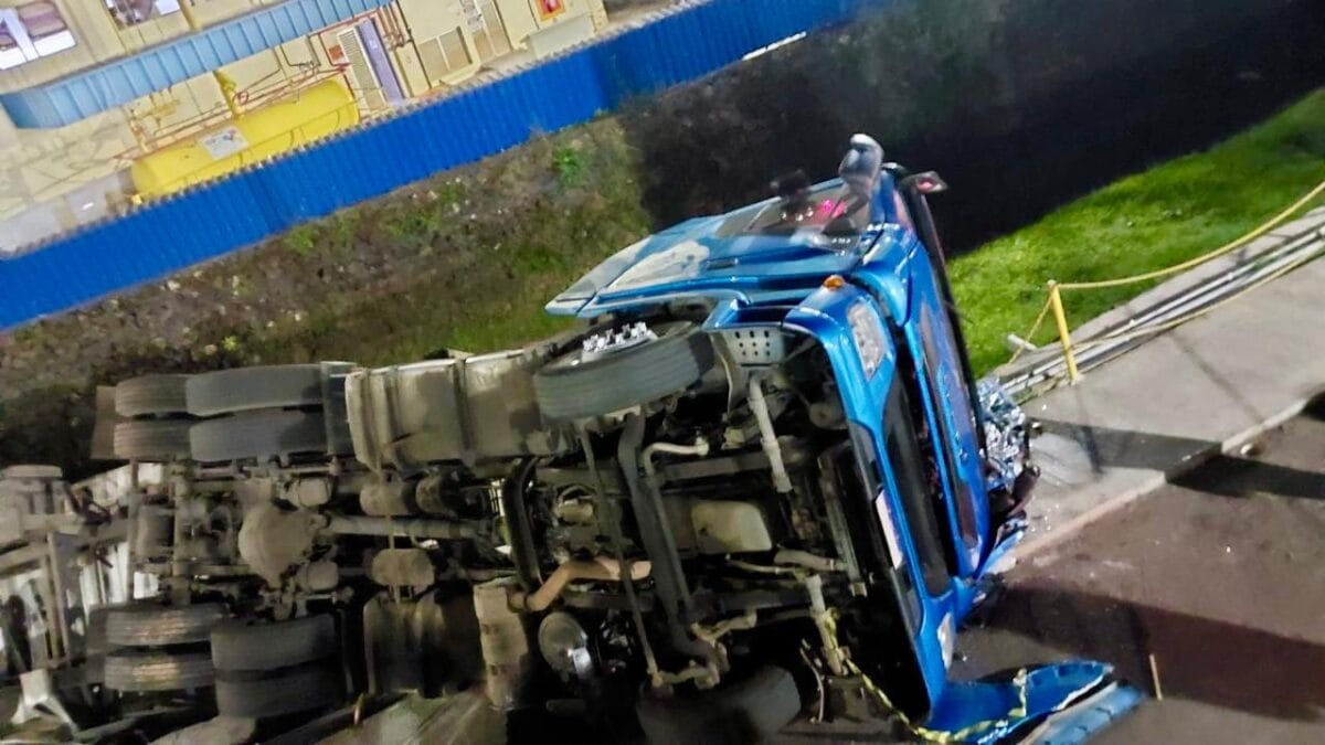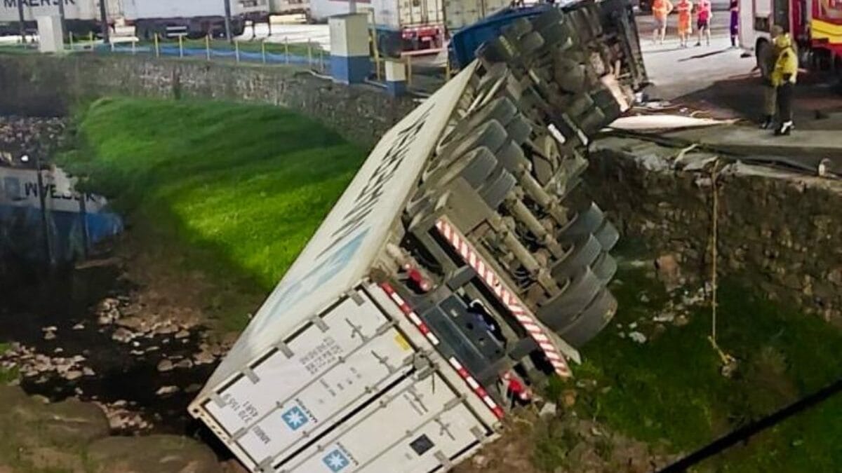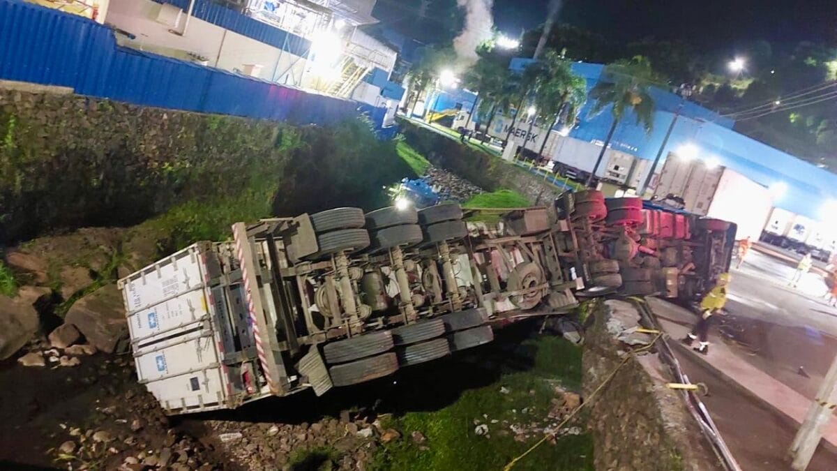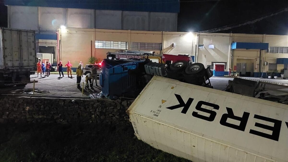 As equipes de socorro encontraram a vítima, que não foi identificada, presa embaixo da cabine já sem vida. O caminhão estava tombado entre o rio e o pátio da empresa.