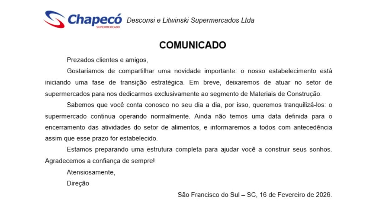 O tradicional Supermercado Chapecó, em São Francisco do Sul, no Litoral Norte de Santa Catarina, anunciou o encerramento das atividades na cidade. No entanto, a direção do comércio informou que abrirá um novo estabelecimento no local em breve.