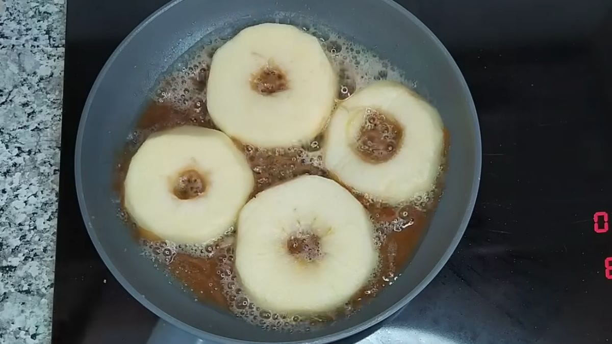 Primeiro, descasque e corte a maçã em fatias finas. Em seguida, refogue em uma frigideira com manteiga e uma colher de açúcar até dourar levemente, reservando.