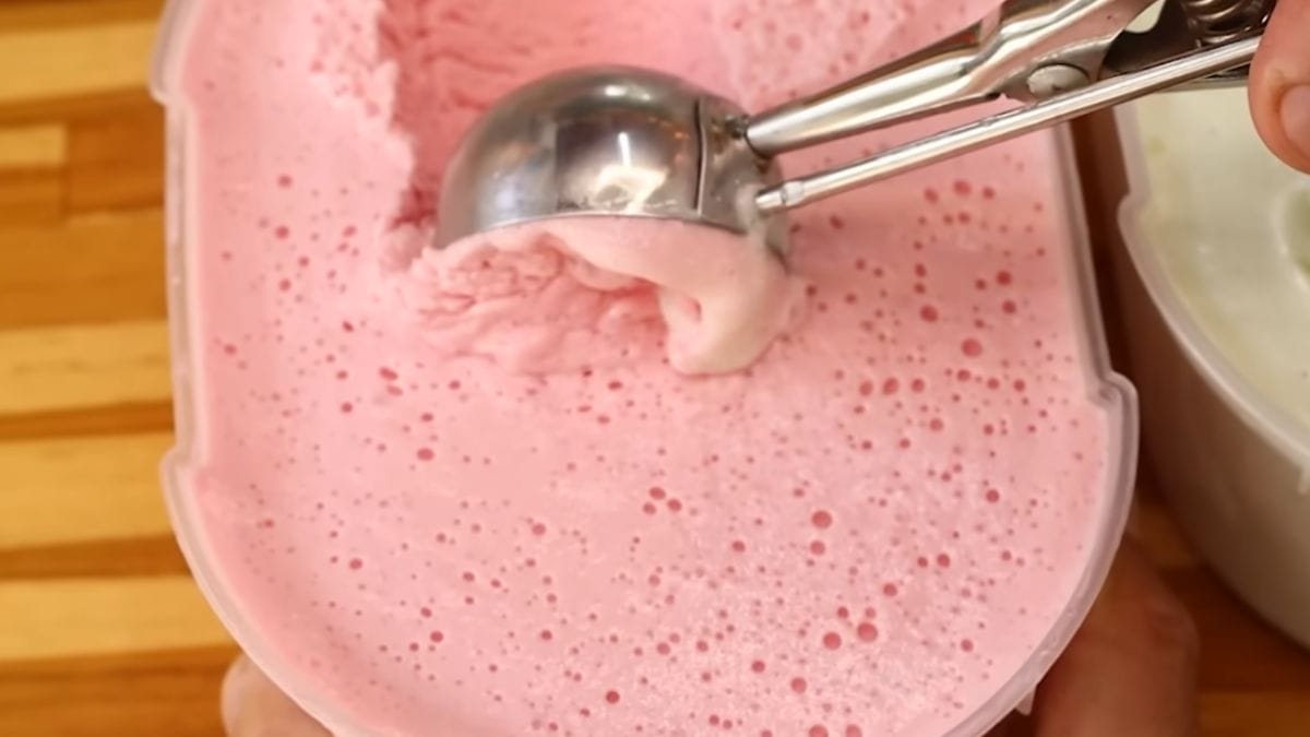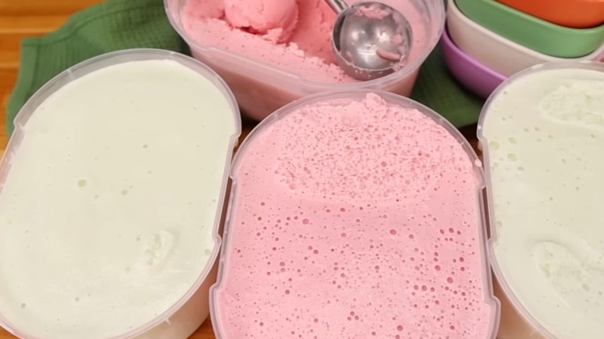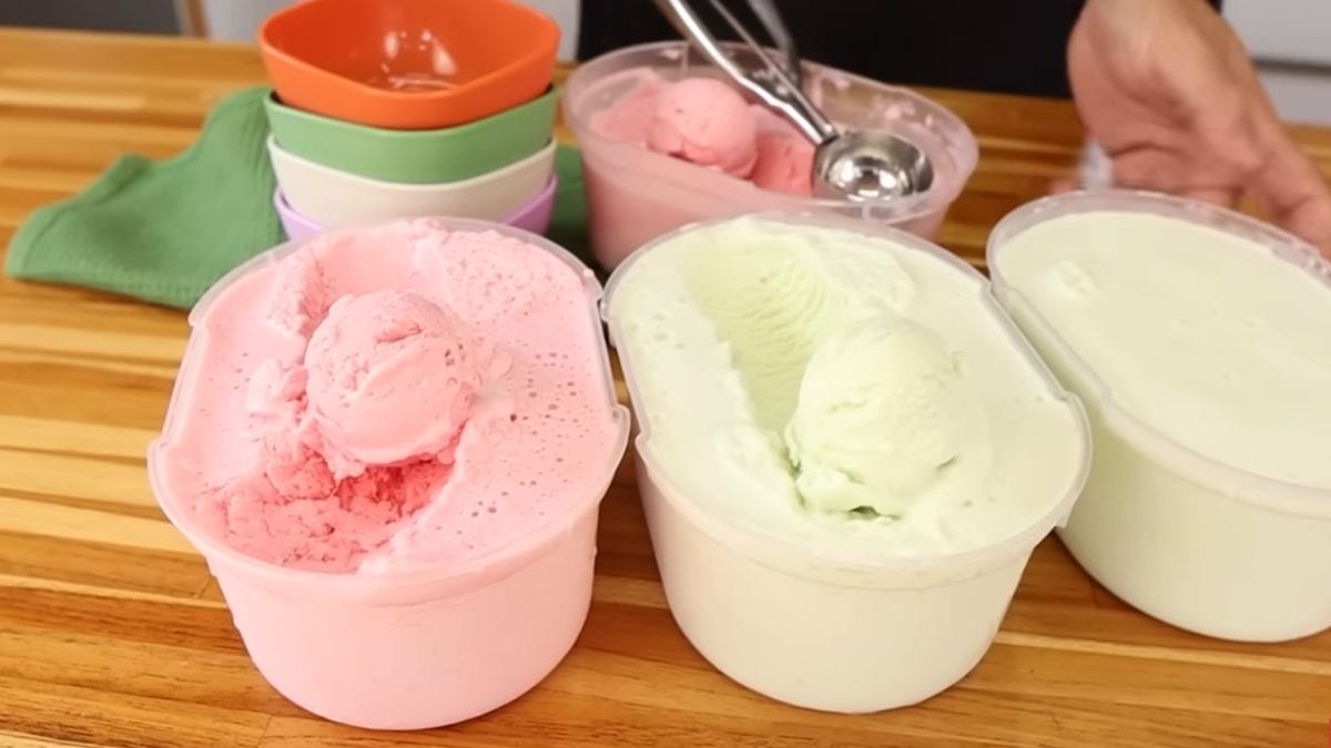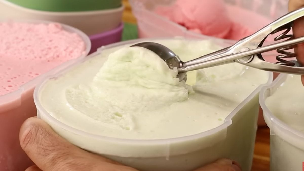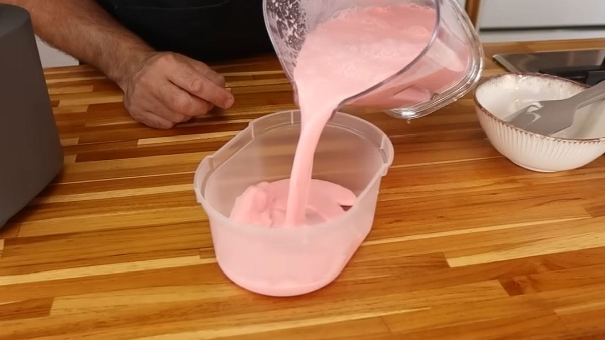 Agora, coloque a mistura em um recipiente de plástico e leve ao freezer. Quando o sorvete começar a congelar, retire do congelador e bata em uma batedeira. Esse passo é essencial para render ainda mais a receita, fazendo o sorvete dobrar de volume.