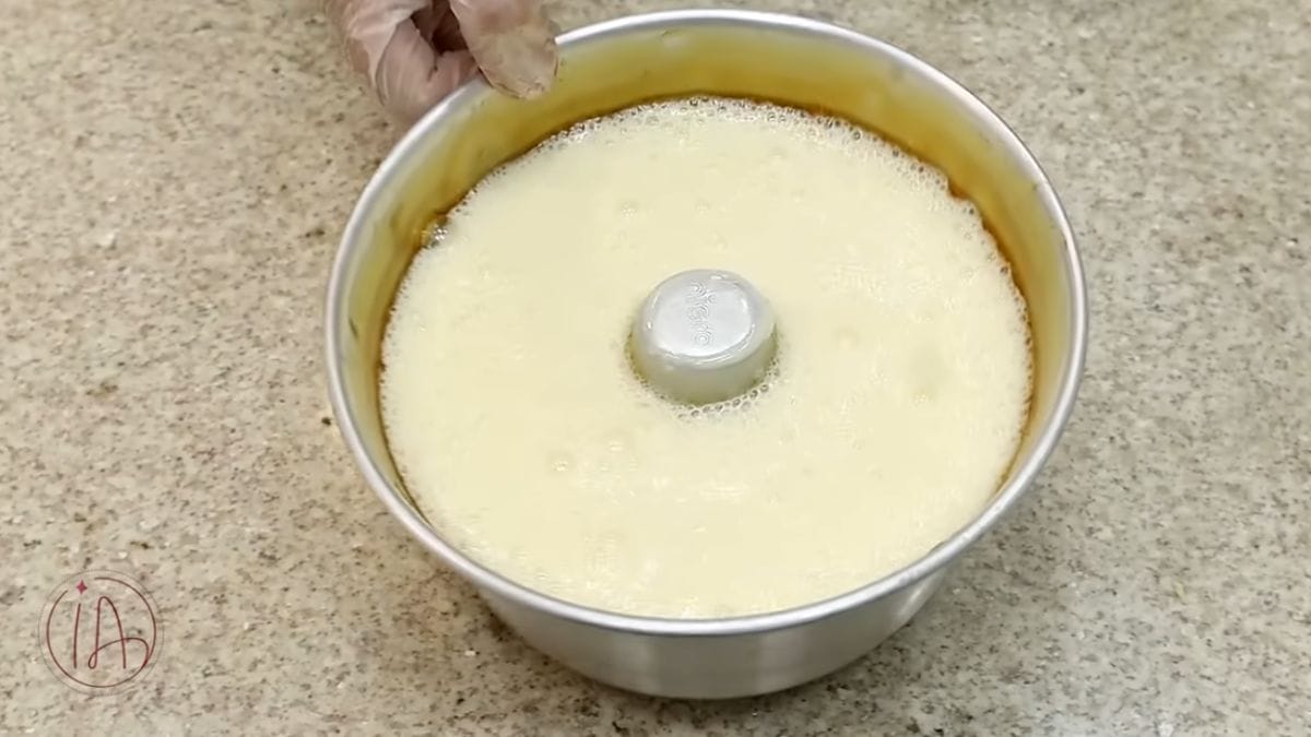 - Coloque a massa na forma de pudim com a calda e deixe em banho-maria com vinagre;