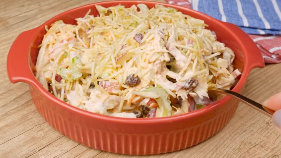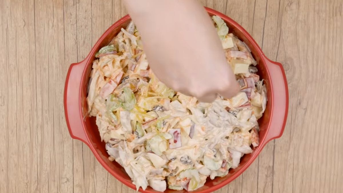 Para finalizar, adicione a maçã picada e a batata palha, envolvendo delicadamente para manter a crocância. Leve à geladeira por pelo menos cinco minutos para que os sabores se integrem e o salpicão fique mais encorpado.
