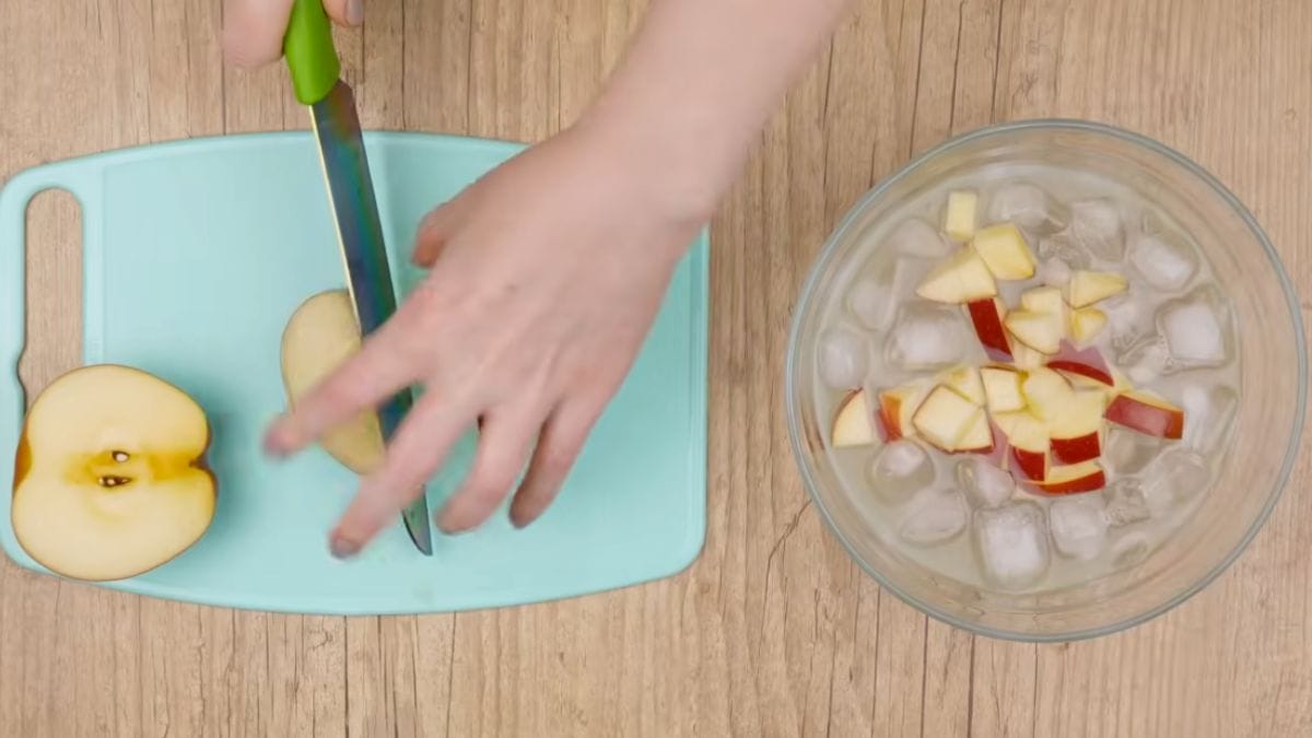 Pique o salsão, o pimentão e a maçã em cubos médios. Para evitar que a maçã fique escura, mergulhe os cubos em suco de limão já preparado ou em uma tigela com água gelada e gelo por alguns minutos antes de escorrer.
