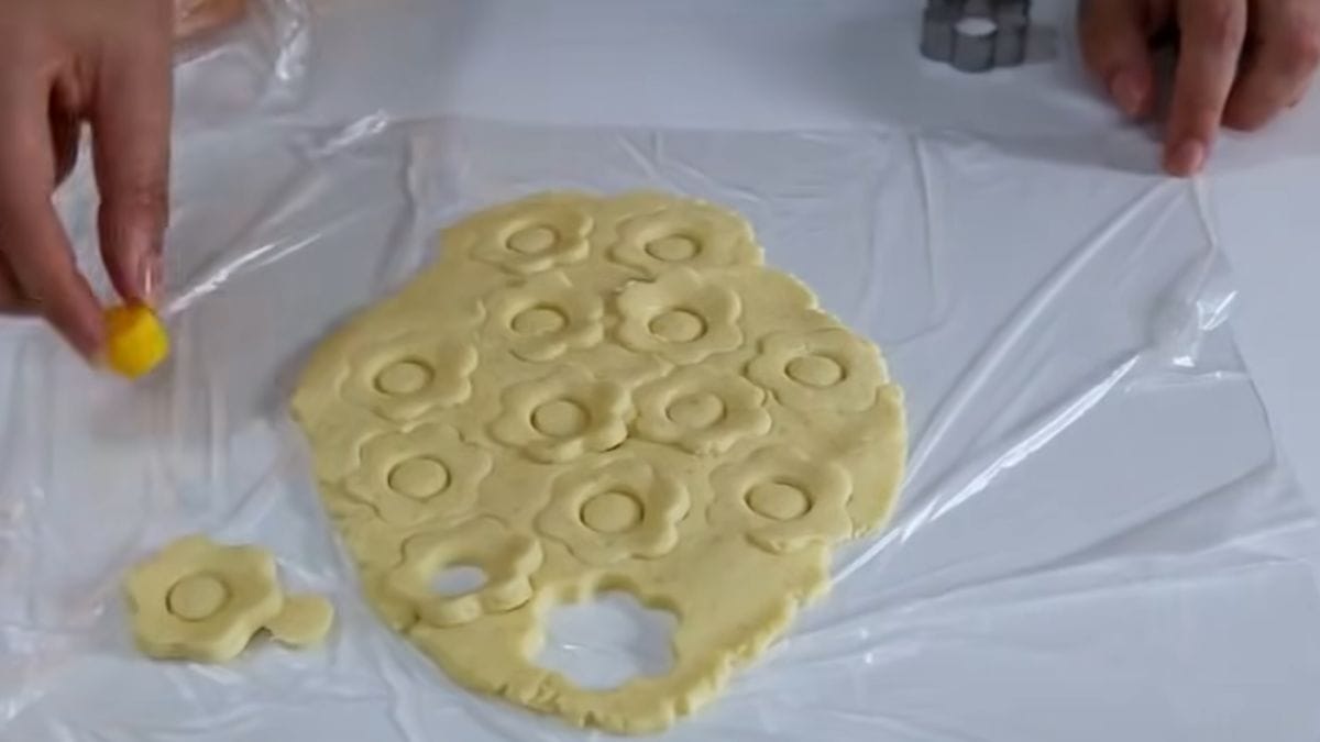 Em seguida, abra a massa com um rolo entre dois plásticos. Não deixe uma espessura muito fina nem muito grossa, use um cortador ou copinho de dose para cortar os biscoitos. Coloque em uma assadeira e leve ao forno pré-aquecido 180°C entre 12 a 15 minutos, ou até estarem levemente douradas. Sirva como preferir.
