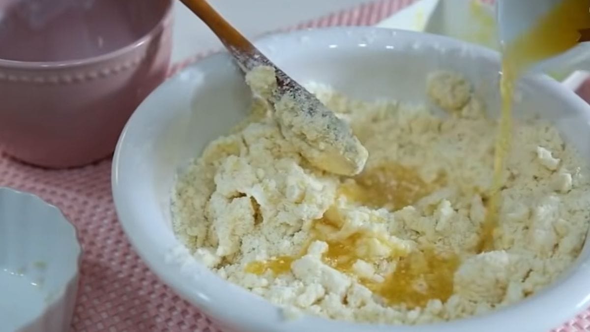Primeiro, coloque em uma tigela os secos e a manteiga, misture bem até formar uma farofa. Depois, acrescente o suco de laranja aos poucos até dar ponto de modelar a massa. Deixe descansar por 20 minutos.