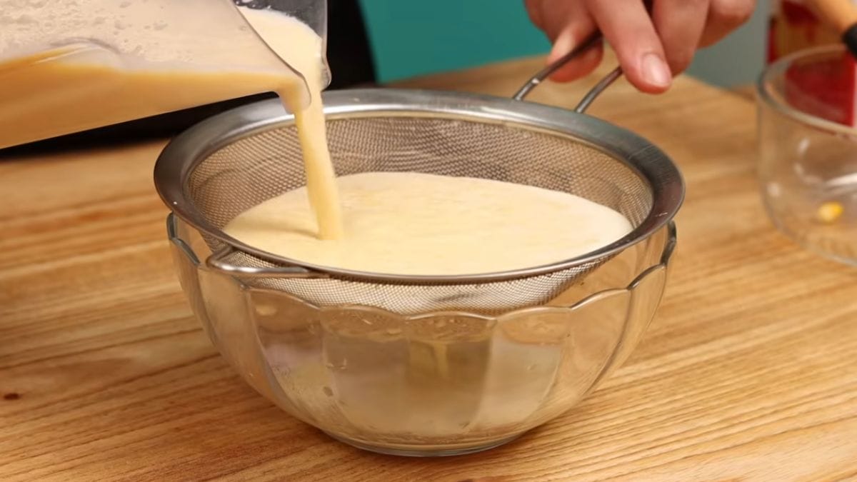 Primeiro, cozinhe o arroz e depois espere secar completamente. Reserve. Em seguida, misture o milho de latinha e o leite em um liquidificador. Agora, peneire a mistura.