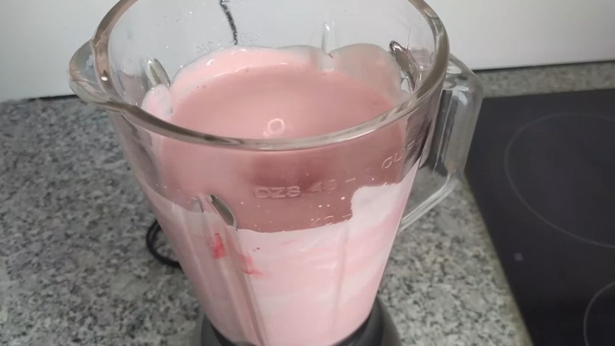 - No liquidificador, adicione 1 caixinha de leite condensado, 1 caixinha de creme de leite (dica: ele gelado ajuda na textura), 1 pacote de suco Tang sabor morango e 400ml de leite. Bata tudo por cerca de 2 minutos;