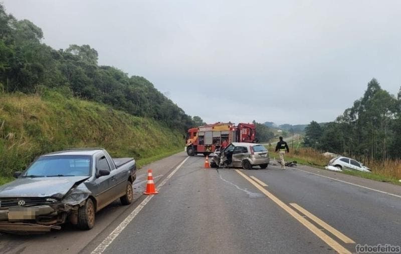 Três pessoas morreram em um acidente grave que envolveu três carros e uma moto na manhã deste domingo (10) em Lages, na Serra Catarinense. Segundo o Corpo de Bombeiros, os mortos estavam em dois veículos que colidiram frontalmente na BR-282, bairro Boqueirão, por volta das 6h. Um homem de 34, outro de aproximadamente 55 anos e uma mulher de 36 morreram. Um homem ficou ferido e outras duas pessoas saíram ilesas.