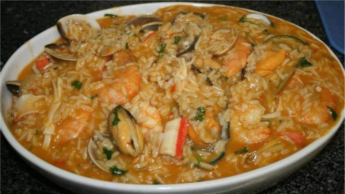 O arroz de marisco é um prato principal que leva diversos frutos do mar e arroz.