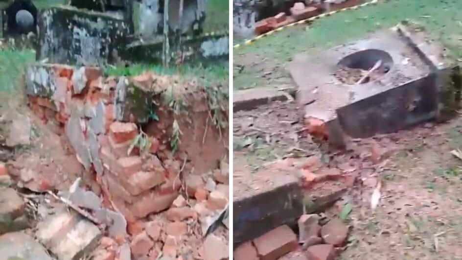 Imagens feitas no local mostram parte dos túmulos quebrados, com tijolos caídos ao chão e a tampa das estruturas rachadas.