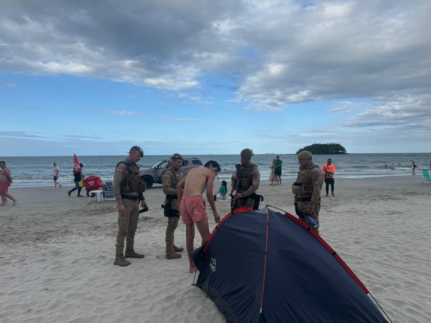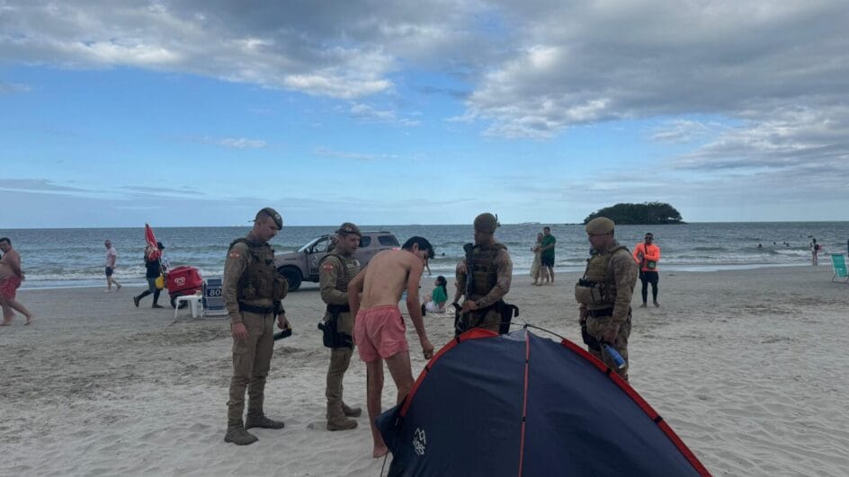 A Polícia Militar recolheu, neste domingo (4), três barracas de camping de turistas na Praia Central de Balneário Camboriú. Alguns estavam acampados na areia desde antes do Réveillon, o que é proibido pelo código de posturas da cidade. A PM argumenta que conveniências abertas 24 horas por dia incentivam que essas permaneçam no local com amplo acesso a álcool, gerando problemas de segurança pública.